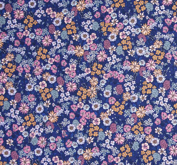 Popelín de algodón estampado de flores tropicales sobre fondo azul oscuro. Perfecta para blusas, faldas, vestidos o ropa infantil.
